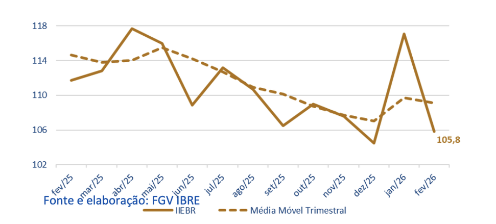 (Brasília-DF, 27/02/2026) Nesta sexta-feira, 27, a FGV-IBRE divulgou o seu  Indicador de Incerteza da Economia (IIE-Br) que  caiu 11,3 pontos em fevereiro, para 105,8 pontos. Na métrica de médias móveis trimestrais, o indicador recuou 0,6 ponto, para 109,1 pontos.
