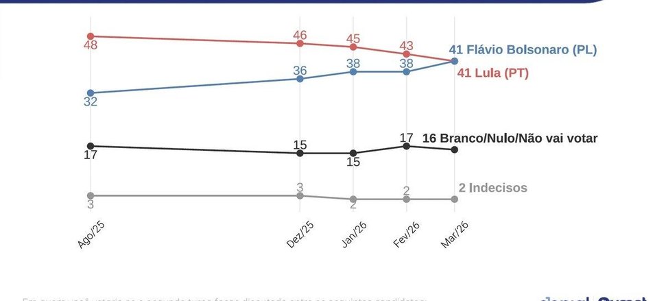 (Brasília-DF, 11/03/2026) Nesta quarta-feira, 11, foi divulgada pesquisa presidencial da parceria Genial/Quaest mostrando que o presidente Luiz Inácio Lula da Silva continua liderando todas as disputas possíveis de primeiro turno, perde apoios, mas continua liderando e no segundo turno, a disputa mais competitiva é entre Lula e o senador Flávio Bolsonaro(PL-RJ), com 41% para cada, configurando empate numérico.