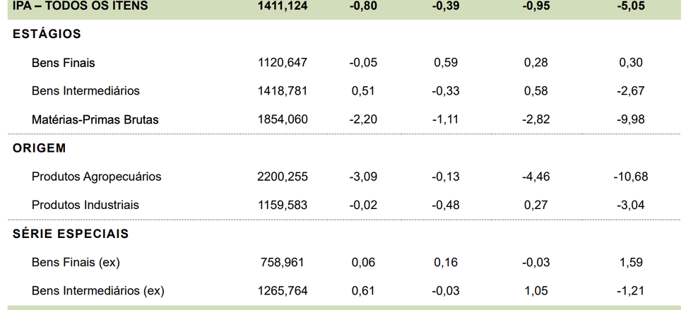 “Nesta apuração, o índice de preços ao produtor segue registrando queda nas commodities de maior peso, especialmente minério de ferro, soja e milho. O recuo do IPA não foi mais intenso devido à elevação dos preços de produtos da pecuária, como bovinos, carne e leite. No âmbito do consumidor, cuja taxa apresentou desaceleração expressiva, destacam-se os movimentos de cursos formais e passagens aéreas, ambos registrando retração em suas taxas de variação. Já na construção civil, altas menos intensas nos custos de mão de obra contribuíram para a desaceleração da inflação nesse segmento.”, afirma André Braz, economista do FGV IBRE.
