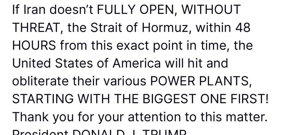 "Se o Irã não ABRIR TOTALMENTE, SEM AMEAÇAS, o Estreito de Ormuz, dentro de 48 HORAS a partir deste exato momento, os Estados Unidos da América atacarão e destruirão suas diversas USINAS DE ENERGIA, COMEÇANDO PELA MAIOR DELAS!", escreveu Trump.