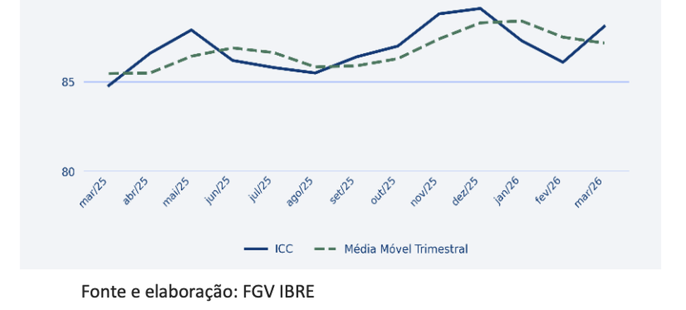 (Brasília-DF, 25/03/2026) Nesta quarta-feira, 25, a FGV-IBRE divulgou o seu Índice de Confiança do Consumidor (ICC) que avançou 2,0 pontos em março, para 88,1 pontos, maior nível desde dezembro de 2025 (89,1 pontos). Na média móvel trimestral, o índice recuou 0,3 ponto, para 87,2 pontos.