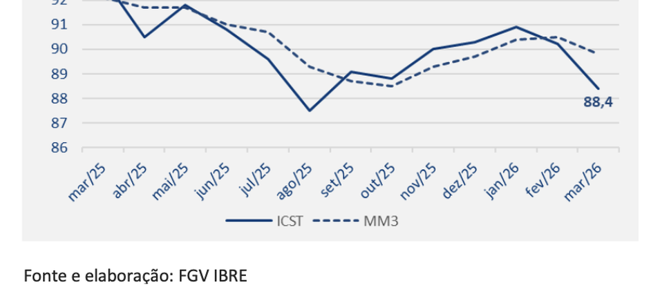 (Brasília-DF, 30/03/2026) Na manhã desta segunda-feira, 30, o FGV-IBRE divulgou o seu Índice de Confiança de Serviços (ICS) que recuou 1,8 ponto em março, para 88,4 pontos. Na média móvel trimestral, o índice cedeu 0,7 ponto, para 89,8 pontos, revertendo a tendência de alta observada nos quatro meses anteriores.