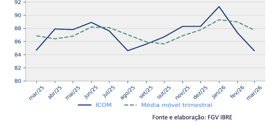 (Brasília-DF, 30/03/2026). Na manhã desta segunda-feira, 30, o FGV-IBRE divulgou o seu Índice de Confiança do Comércio (ICOM) que caiu 2,7 pontos em março, para 84,6 pontos. Em médias móveis trimestrais, o índice recuou 1,3 ponto, para 87,7 pontos.