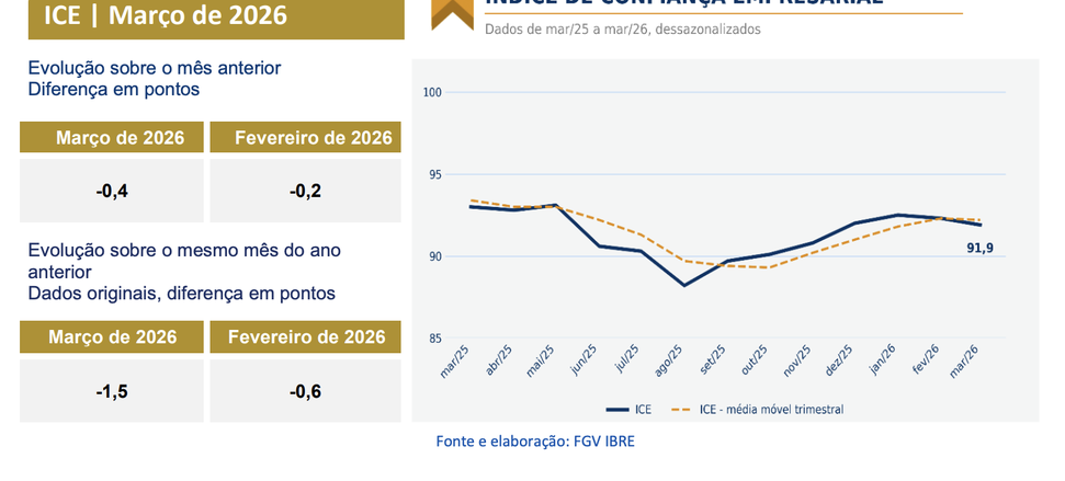 (Brasília-DF, 01/04/2026). Nesta quarta-feira, 01 de abril, a FGV-IBRE divulgou o esperado Índice de Confiança Empresarial (ICE) recuou 0,4 ponto em março, para 91,9 pontos.