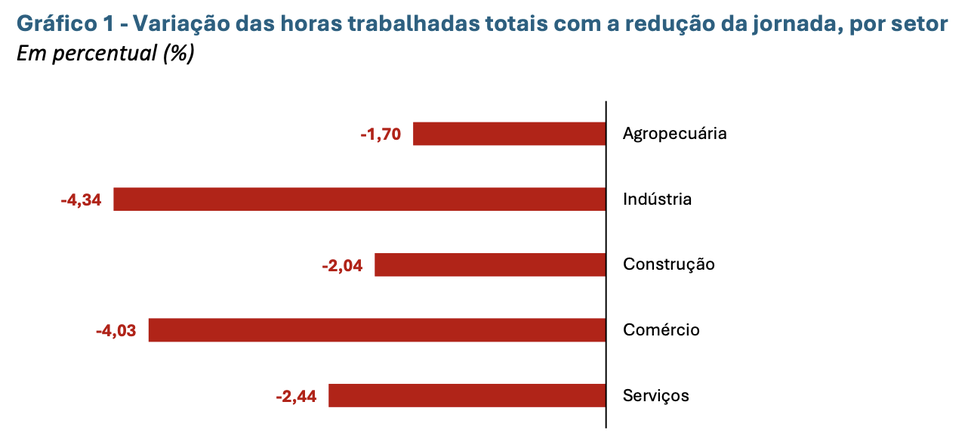 Os números mostram, ainda, que a indústria será o segmento mais atingido em termos de diminuição de horas trabalhadas caso o Congresso Nacional aprove a redução da jornada de trabalho para 40 horas semanais, com queda de 4,34% das horas trabalhadas. Na sequência, aparecem o comércio, com redução de 4,03%; serviços (-2,44%); construção (-2,04%); e agropecuária (-1,70%).