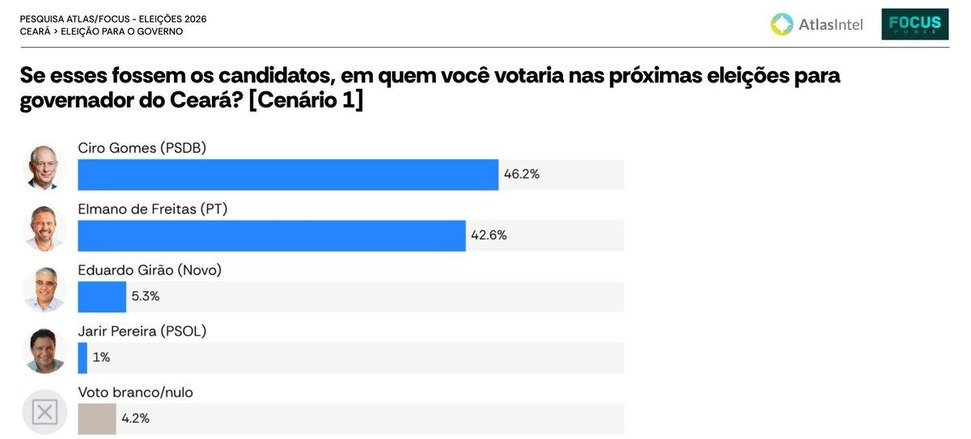 Pesquisa AtlasIntel mostra Ciro Gomes com 46,2% e o governador Elmano de Freitas com 42,6% na disputa para Governo do Ceará, Lula lidera com grande vantatem no Ceará