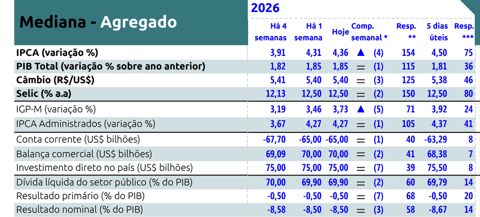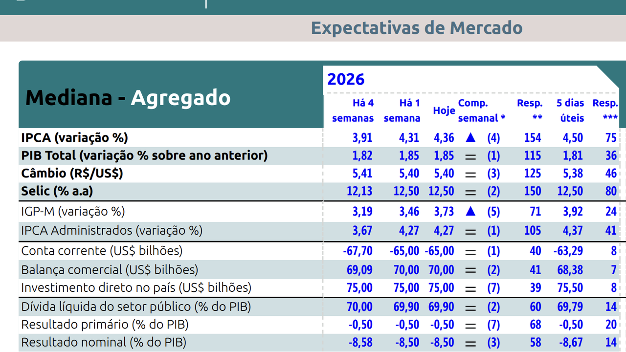 (Brasília-DF, 06/04/2026). A Política Real teve acesso ao relatório da pesquisa Focus que foi publicada hoje, 06, mas que foi fechada ainda na quinta-feira, 2, apontando que pela quarta semana seguida os agentes de mercado estimam a inflação, o IPCA em alta, agora estimado em 4,36% a final do ano. O PIB foi estimado em estabilidade em 1,85%.