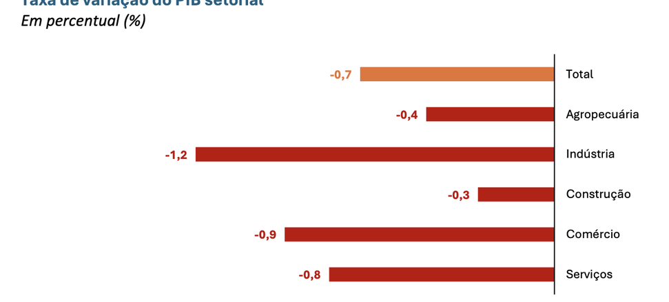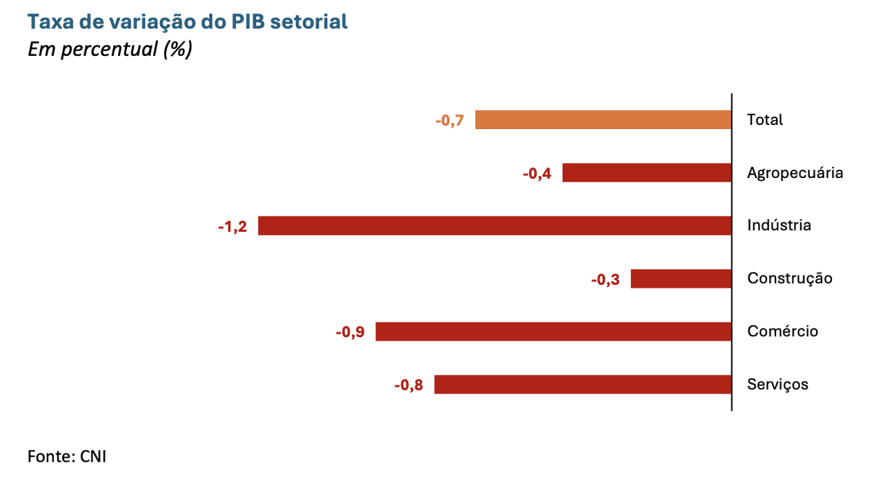 Depois da indústria, com queda de 1,2%, o setor mais impactado será o do comércio (-0,9%, equivalente a R$ 11,1 bilhões). Na sequência, aparecem os setores de serviços (-0,8%, o equivalente a R$ 43,5 bilhões), a agropecuária (-0,4%, cerca de R$ 2,3 bilhões) e o setor de construção (-0,3%, R$ equivalente a 921,8 milhões).