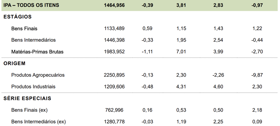 Em abril, o Índice de Preços ao Produtor Amplo (IPA) subiu 3,81%, invertendo o comportamento observado em março, quando registrou queda de 0,39%. Analisando os diferentes estágios de processamento, percebe-se que o grupo de Bens Finais apresentou aceleração, passando de 0,59% em março para 1,15% em abril. Da mesma forma, o índice correspondente a Bens Finais (ex), que exclui os subgrupos de alimentos in natura e combustíveis para o consumo, subiu de 0,16% em março para 0,53% em abril. A taxa do grupo Bens Intermediários subiu 1,95% em abril, invertendo o movimento de março, quando o índice caíra 0,33%. O índice de Bens Intermediários (ex) (excluindo o subgrupo de combustíveis e lubrificantes para a produção) aumentou 1,19% em abril, após queda de 0,03% mês anterior. O estágio das Matérias-Primas Brutas registrou alta intensa em sua taxa de variação em relação ao mês anterior, passando de -1,11% em março para 7,01% em abril.