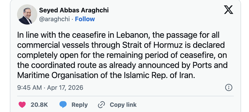 "Em consonância com o cessar-fogo no Líbano, declara-se completamente aberta a passagem de todos os navios comerciais pelo Estreito de Ormuz durante o restante período do cessar-fogo, pela rota coordenada já anunciada pela Organização de Portos e Assuntos Marítimos da República Islâmica do Irã" publicou nesta sexta-feira (17) no X.