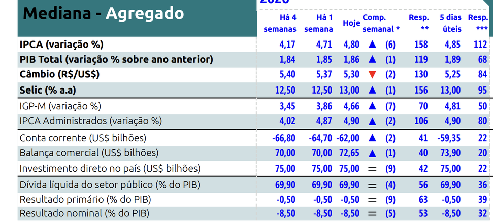 Para o ano que vem está estimada queda do câmbio e do investimento direto. Vários índices estimado em alta como Selic, dívida líquida e contra corrente.