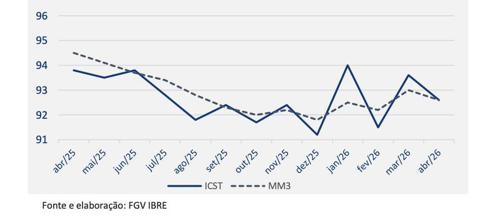 (Brasília-DF, 27/04/2026) Nesta segunda-feira, 27, o FGV-IBRE divulgou a sua pesquisa Índice de Confiança da Construção (ICST), que recuou 1,0 ponto em abril, para 92,6 pontos, registrando o menor nível desde março de 2022 (93,4 pontos). Na média móvel trimestral, o índice também apresentou queda, de 0,4 ponto.