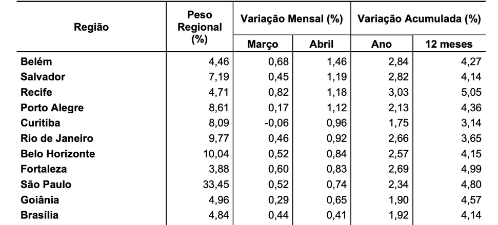 Quanto aos índices regionais, a maior variação foi registrada em Belém (1,46%), por conta das altas do açaí (12,79%) e da gasolina (9,33%). Já o menor resultado ocorreu em Brasília (0,41%), que apresentou queda nos preços da passagem aérea (-10,88%) e dos produtos farmacêuticos (-0,61%).