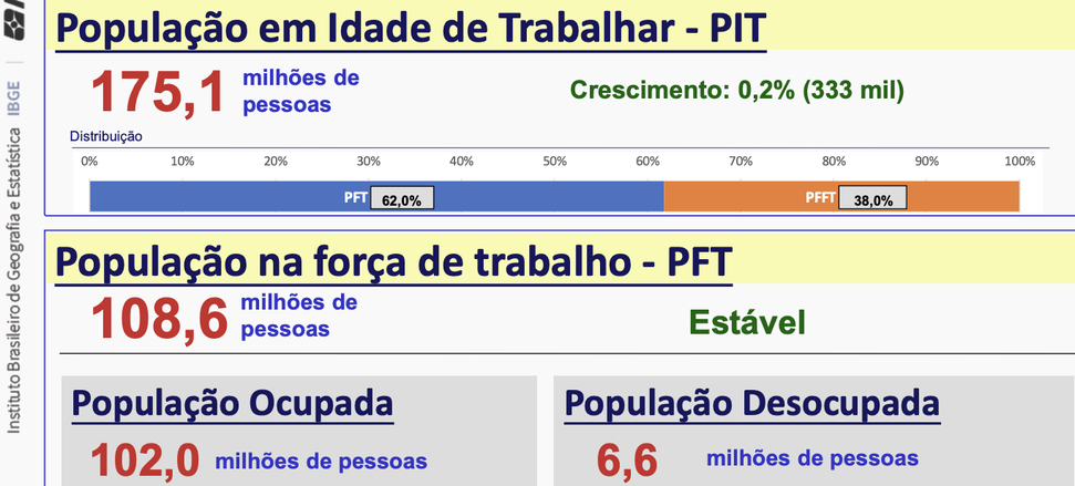 O contingente na força de trabalho (pessoas ocupadas e desocupadas), no trimestre de janeiro a março de 2026, foi estimado em 108,6 milhões de pessoas, permanecendo estável, no trimestre e crescendo 0,4% (mais 478 mil pessoas) no ano.