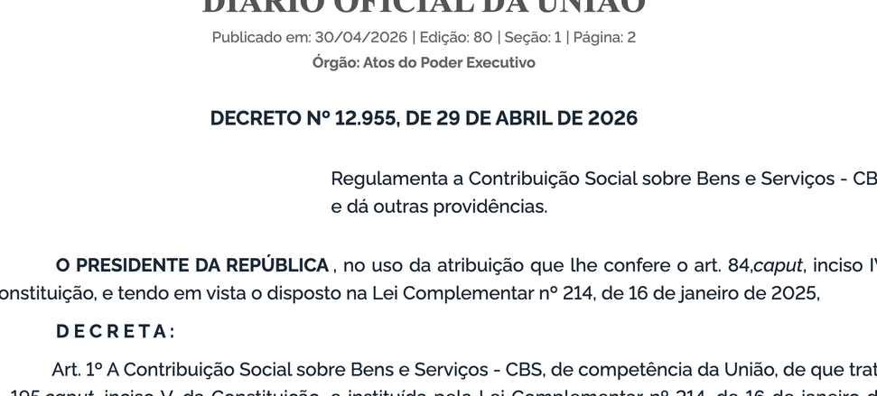 (Brasília-DF, 30/04/2026). Nesta quinta-feira, 30, foi publicado no Diário Oficial da União, o Decreto Nº 12.955, assinado pelo presidente Luiz Inácio Lula da Silva e pelo ministro da Fazenda, Dario Durigan, que regulamenta a Contribuição Social sobre Bens e Serviços – CBS. A Contribuição Social sobre Bens e Serviços é um tributo instituído pela Lei Complementar Nº 214/2025, no âmbito da Reforma Tributária Sobre o Consumo.